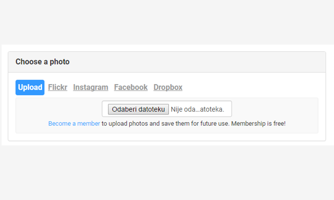 U tražilici upišite BigHugelabs te na stranici odberite Badge maker ili jednostavnije kliknite na poveznicu http://bighugelabs.com/badge.php. Odaberite fotografiju koju želite postaviti na akreditaciju. Možete je učitati sa svog računala ili preuzeti s Dropboxa i društvenih mreža na koje ste prijavljeni. (Za izradu učeničkih akreditacija koje smo koristili u razredu ponekad sam učitavala fotografije učenika, a često sam znala na mjesto fotografije postaviti neke junake iz aktualnih crtanih filmova koje učenici vole.)