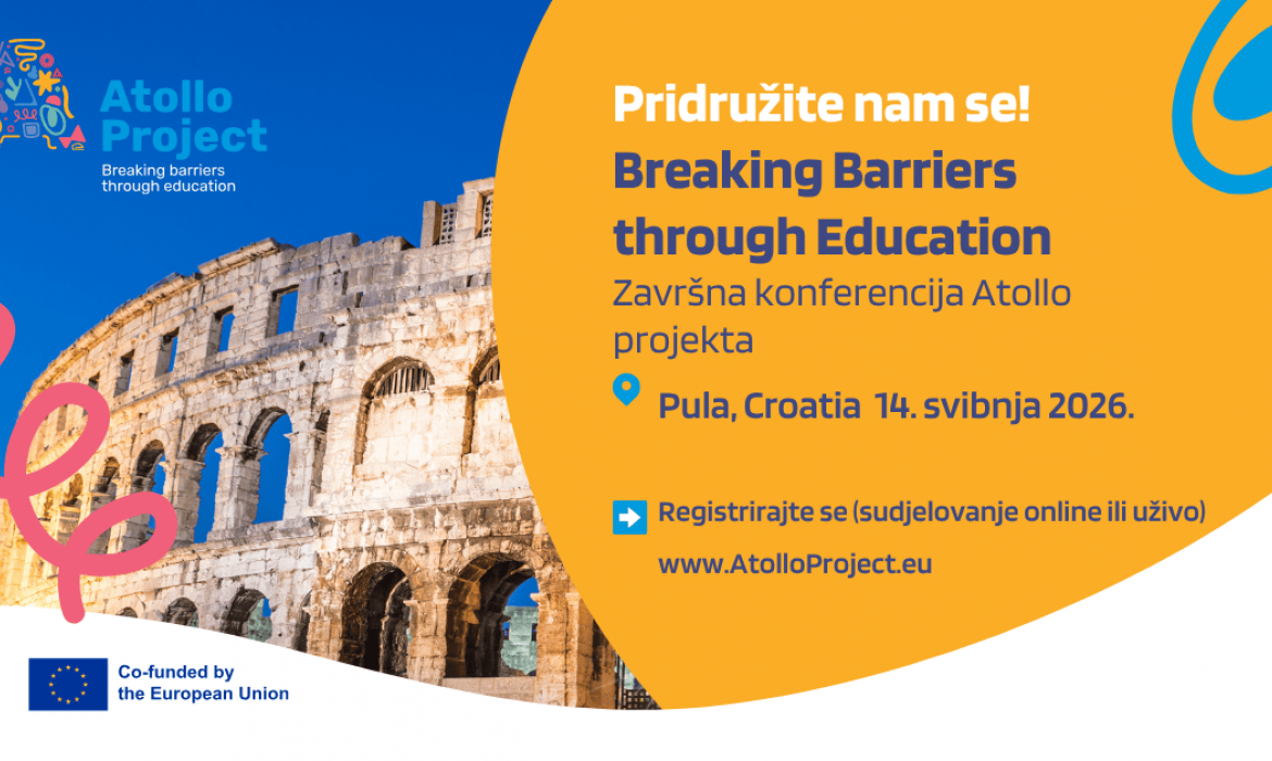 Partneri i odgojno-obrazovni djelatnici te studenti su pozvani da prisustvuju besplatnoj završnoj konferenciji projekta Atollo pod nazivom "Breaking Barriers through Education", koja će se održati 14. svibnja 2026. u Coworking centru Pula (11:00 – 16:00 sati). Događaj će okupiti odgojno-obrazovne djelatnike, znanstvenike i donositelje odluka kako bi razmijenili spoznaje iz projekta Atollo i istražili budućnost inkluzivnog digitalnog obrazovanja. Moguće je sudjelovanje uživo i online. Prijave su otvorene na: https://atolloproject.eu.