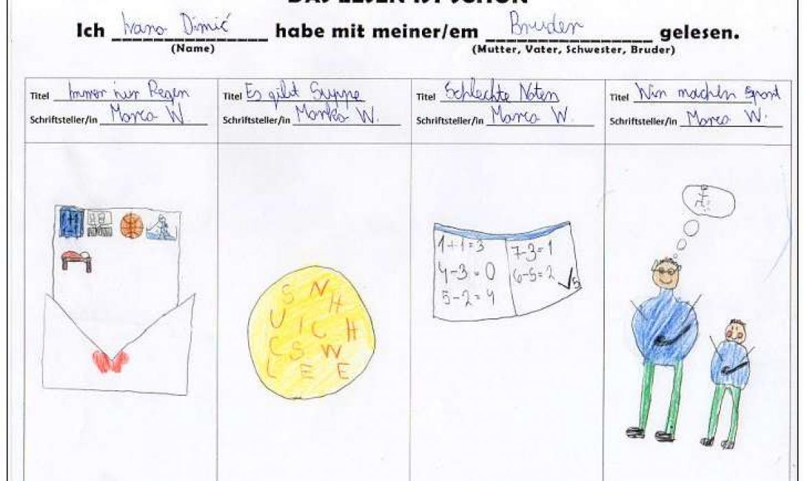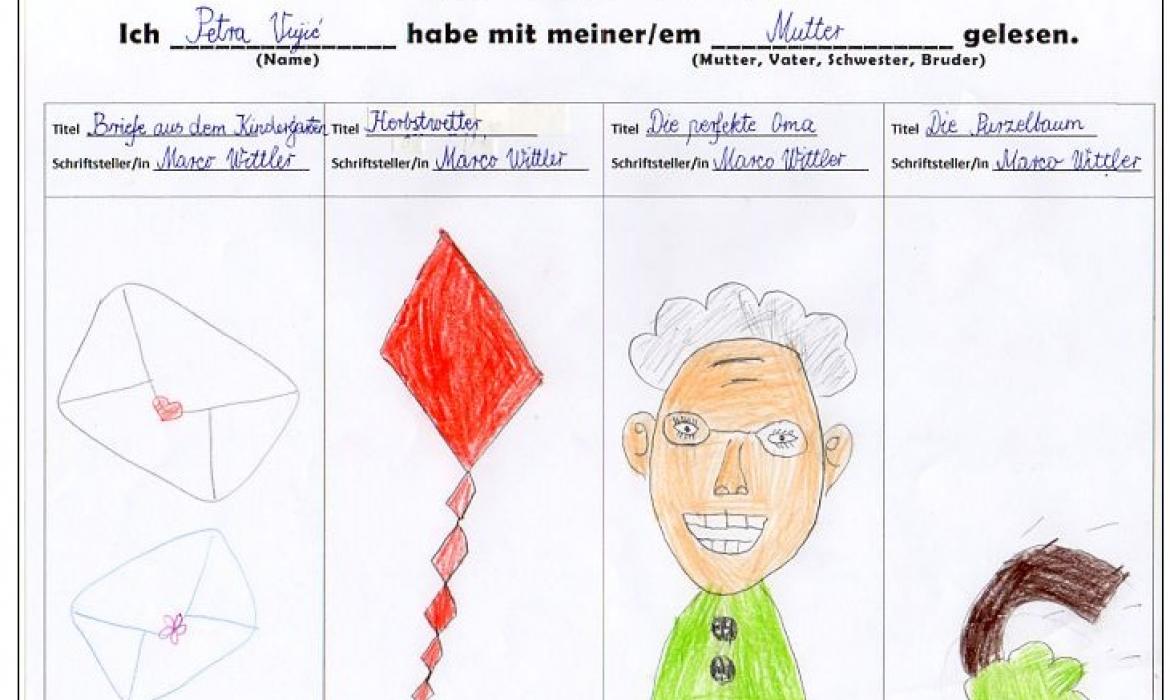 Sat možemo započeti kratkom igricom, npr. vješalima gdje učenici trebaju pogoditi naslov (npr. Das Lesen ist schön). Nastavit ćemo s umnom mapom ili olujom ideja. Na sredinu ploče napisat ćemo BUCH ili LESEN, a učenici će dolaziti te zapisivati riječi koje ih asociraju na čitanje. Provjerit ćemo znaju li učenici zašto baš sada govorimo o knjigama te će ujedno dobiti priliku reći koja je njihova najdraža knjiga. Unaprijed ćemo izabrati jednu kratku priču te ju izrezati u nekoliko dijelova, a učenici će dobiti zadatak ponovno ju sastaviti. Zajedno ćemo pročitati priču te će ju učenici prikazati ilustracijom u svojim bilježnicama, prije čega će naravno napisati ime priče i autora. No kako ovdje ne bi bio kraj, zamolit ćemo učenike da kod kuće pročitaju nekoliko priča te popune tablicu (u prilogu) na sličan način kao što su to napravili u bilježnicama. Pred kraj Mjeseca knjige ti radovi bit će izloženi u učionici ili u holu škole kako bi ih svi mogli vidjeti.