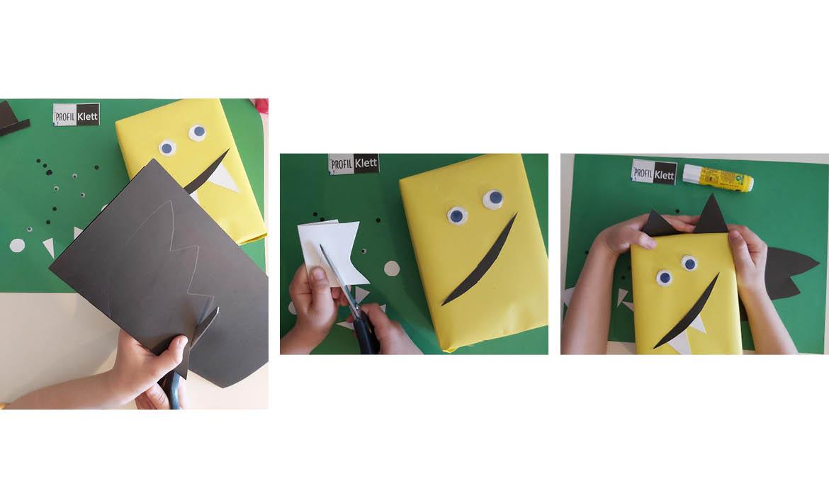 Bernard je odabrao veću praznu kutiju kao tijelo čudovišta. Nju je omotao kolaž-papirom onako kako inače zajedno omatamo darove.