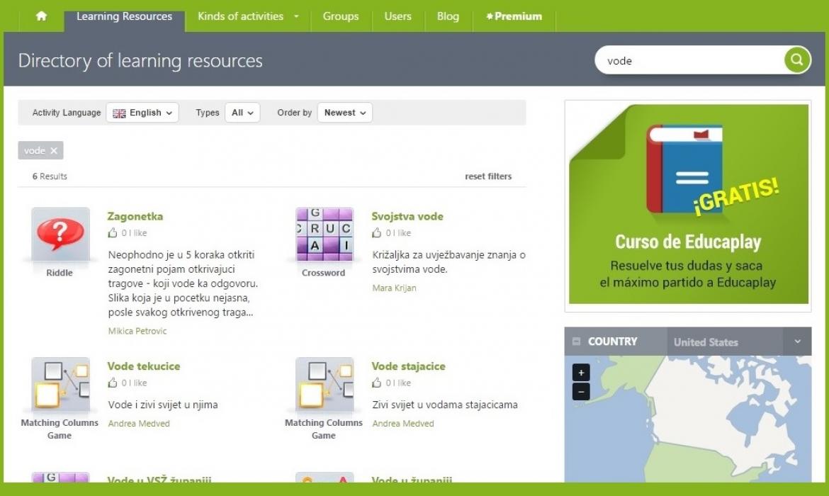Imate i opciju pretraživanja banke digitalnih nastavnih sadržaja. Dok se još uvijek nalazite na stranici „Izvori učenja“ - Learning resources , u desnom kutu nudi vam se mogućnost pretraživanja gotovih aktivnosti, od kojih su brojne na hrvatskom jeziku, iz različitih nastavnih područja.