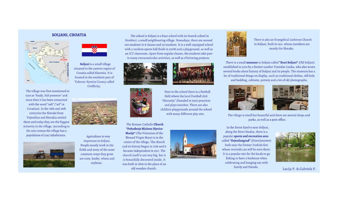 Projekt je bio podijeljen u četiri „putovanja”, odnosno modula, a u prvom modulu učenici su tijekom siječnja imali zadatak predstaviti svoju državu, grad i školu. Naši učenici su izradili turistički vodiču u Canvi u kojem predstavljaju svoje selo Soljane i najvažnije znamenitosti u njemu. Učenici su našu školu predstavili izradom prezentacije u Book Creatoru, koju možete pogledati na ovoj poveznici https://bit.ly/OSSoljani.