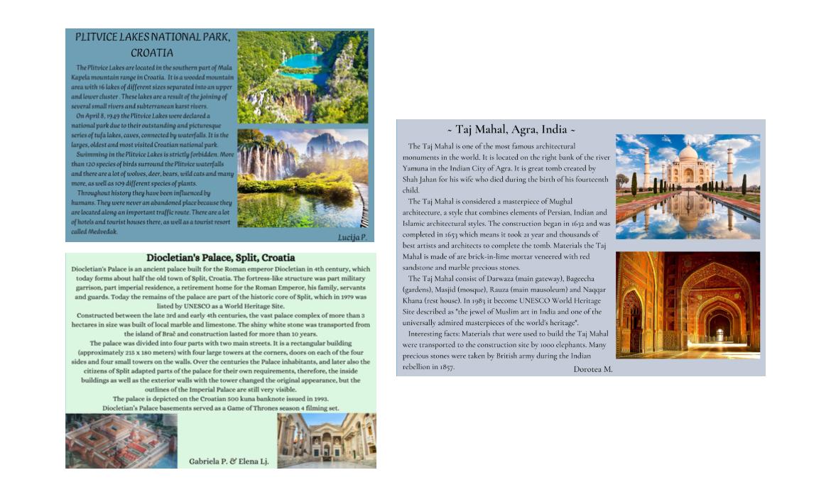 Zadnji modul je odrađen tijekom travnja kada smo obilježili Međunarodni dan kulturne baštine („World Heritage Day”) koji se obilježava svake godine 18. travnja, a za koji su naši učenici izradili e-knjigu u Book Creatoru (https://bit.ly/WorldHeritageDaySoljani) u kojoj su predstavili Plitvička jezera, Dioklecijanovu palaču u Splitu i Taj Mahal u Indiji, koji se nalaze na UNESCO-voj listi zaštićene svjetske kulturne baštine. Ako želite putovati po Europi i svijetu i razgledati zanimljive spomenike i predivne prirodne ljepote, obavezno posjetite našu zajedničku Padlet stranicu sa svim prezentacijama i dodatnim digitalnim edukativnim materijalima na ovoj poveznici: https://padlet.com/vanda_nunes_etw/7r1jbd4au3db1mn7
