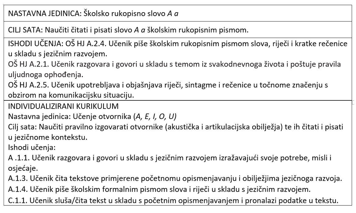 U motivacijskom dijelu sata svi učenici zajedno igraju igru pantomime (mačka, pas, lav) i nazive životinja pišu na ploču. Učenica/učenik s Down sindromom na ploču uz poticaj piše PAS i pred svima oponaša psa još jednom. Dok učenici pronalaze zajedničko svojstvo riječi napisanih na ploču (u svakoj riječi je otvornik a), pomoćnica/pomoćnik u nastavi učenici/učeniku s Down sindromom pokazuje sve otvornike na nastavnom listiću. Tijekom obrade školskog rukopisnog slova a (uočavanje izgleda pisanoga slova, usporedba tiskanoga slova s pisanim, pisanje velikoga i maloga pisanog slova u slobodnome prostoru, pisanje pisanoga slova u crtovlje) učenica/učenik s Down sindromom prstom pokazuje i izgovara otvornike na listiću, između slova abecede otkriva i zaokružuje otvornike te zajedno s ostalim učenicima zrakom piše veliko slovo A svojim prstićem. U svoju prilagođenu bilježnicu piše otvornike velikim slovima školskog formalnog pisma, svaki otvornik piše u novi red, ispunjava red do kraja pišući uredno i poštujući crtovlje. U etapi sata vježbanje i ponavljanje učenici pišu samo slovo i slogove u crtovlje rukopisnim pismom, a učenica/učenik s Down sindromom pronalazi otvornike na slikovnim rečenicama i pokazuje ih, slikovne rečenice uči čitati i prepisuje dvije rečenice u svoju bilježnicu. Tijekom stvaralačkog rada učenici osmišljavaju rečenice prema fotografijama na ploči (mačka, pas, lav) i pišu po dvije rečenice u pisanku velikim formalnim slovima, dok učenica/učenik s Down sindromom uz pomoć asistentice opisuje što vidi na fotografijama i pred svima izgovara svoje rečenice te pokušava od špage oblikovati neki od otvornika. Domaća zadaća za učenicu/učenika s Down sindromom je naučiti čitati slikovne rečenice i ispisati red nizom zadanih otvornika.