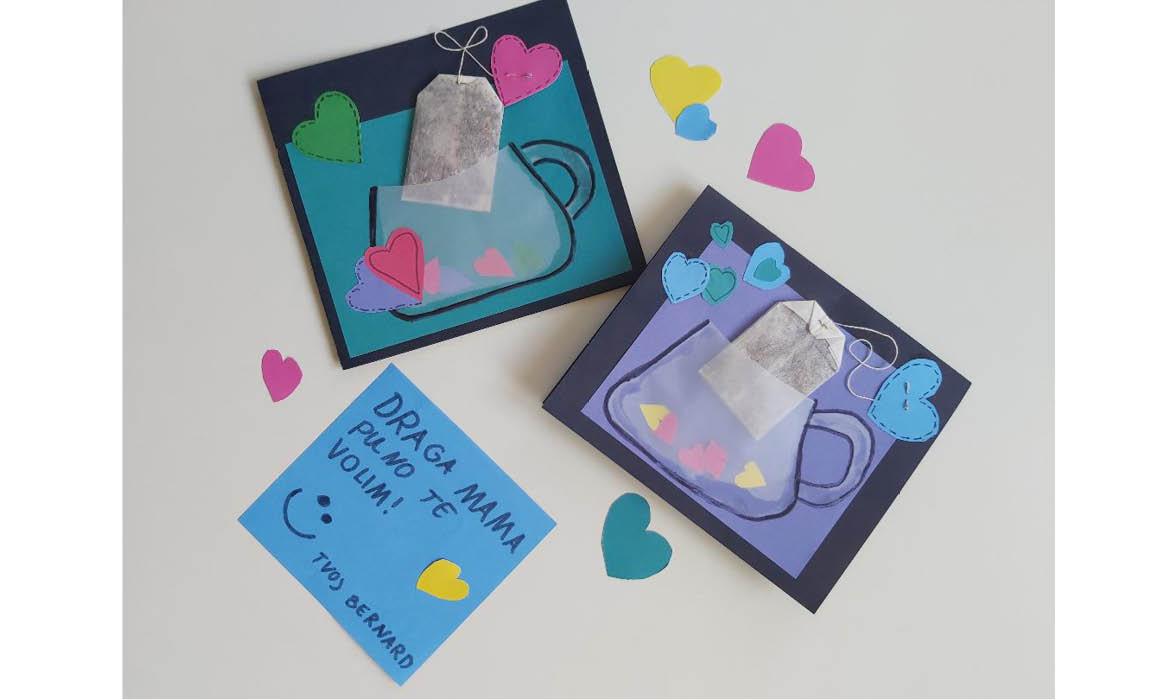Presavili smo plavi koričar iz likovne mape u čestitku i na njega zalijepili ljubičasti kolaž- papir. Šalicu od paus-papira Bernard je pažljivo samo obrubio tekućim ljepilom. Zatim ju je zalijepio na ljubičasti kolaž-papir. Vrh šalice ostavio je slobodan za vrećicu čaja. Nije zaboravio zalijepiti ručkicu šalice.