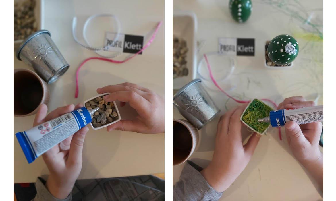 Posudice za cvijeće napunio je kamenčićima ili umjetnom travom. Na vrh je nanio više tekućeg ljepila.