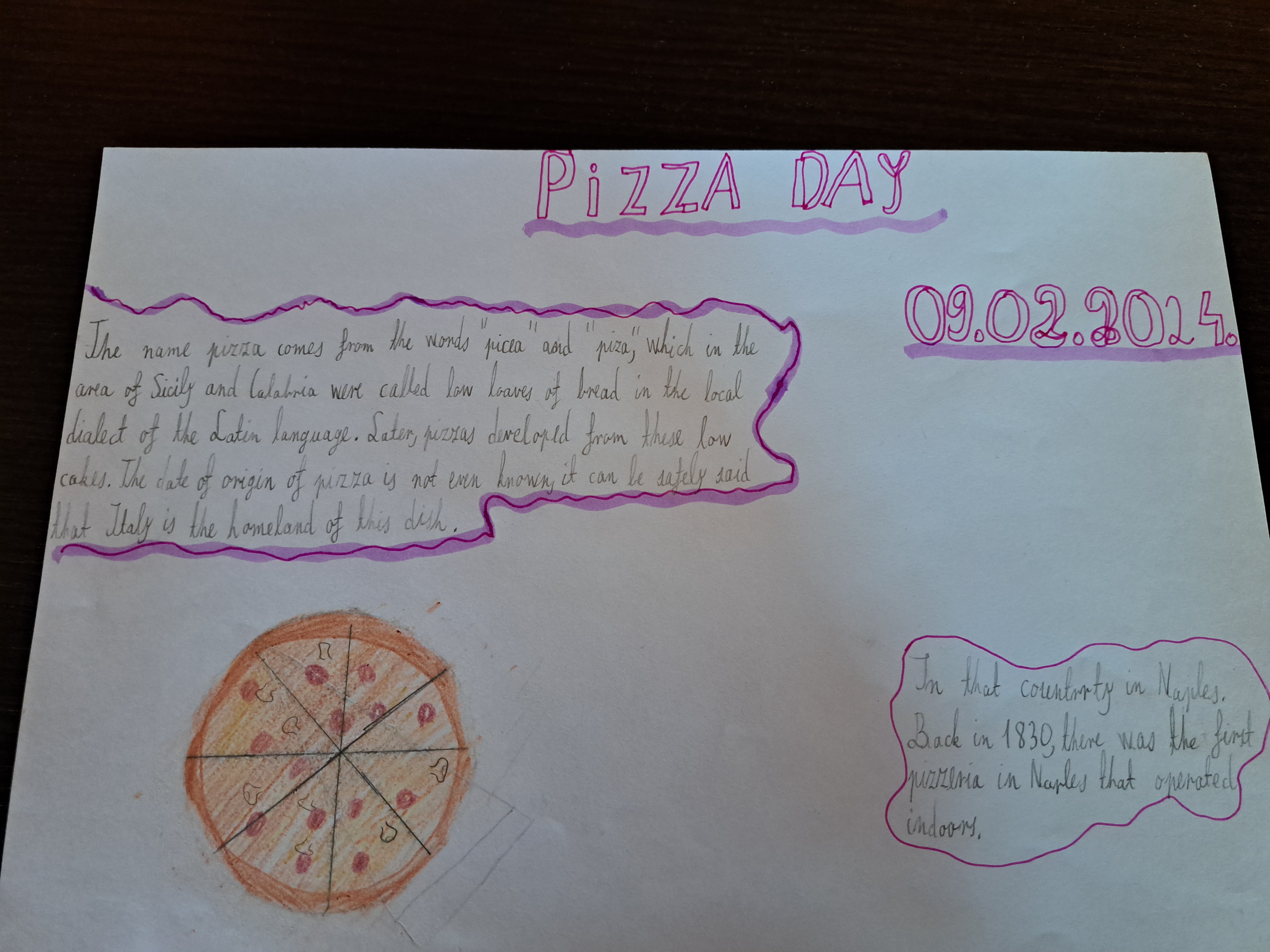 Vođene time, nastavnice Ivana Kozić i Dijana Penava osmisle su obilježavanje Svjetskoga dana pizze i povodom toga organizirale projektni dan. Pri tome naglašavaju kako im je u tome uveliko pomogla školska kuhinja, odnosno kuhar i dvije kuharice, koji su jelovnik prilagodili projektu na veliko oduševljenje svih učenika. Hvala im na tome!