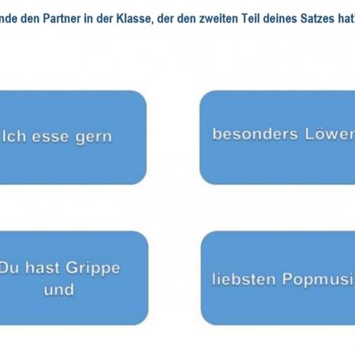 Radni listić sadrži kartice s polovicama rečenica. Učenici moraju pronaći partnera u razredu koji ima drugu polovicu njegove rečenice. Pomoću ove vježbe učenici će kroz igru vježbati razumijevanje njemačkog jezika.